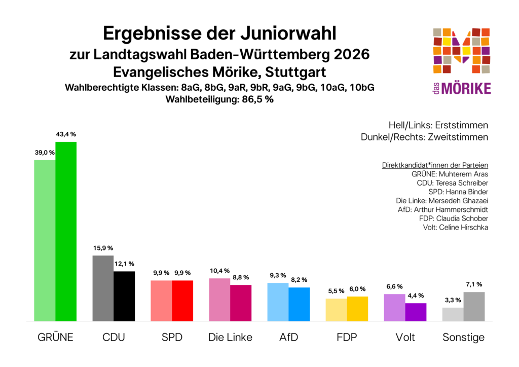 Die Juniorwahl lässt durch ihr handlungsorientiertes didaktisches Konzept auch die Jüngeren Politik hautnah erleben. Daher steht außer Frage, dass das Mörike auch bei der nächsten Juniorwahl wieder mit dabei ist. Denn wer schonmal bei der Juniorwahl mitgemacht hat, für den ist es bestimmt keine große Hürde mehr, auch zur richtigen Wahl zu gehen. Und das ist gut so: Wählen gehen ist die einfachste Form der politischen Beteiligung – und nur wenn viele junge Menschen ihre Stimme abgeben, können ihre Meinungen auch in der Politik Gehör finden.